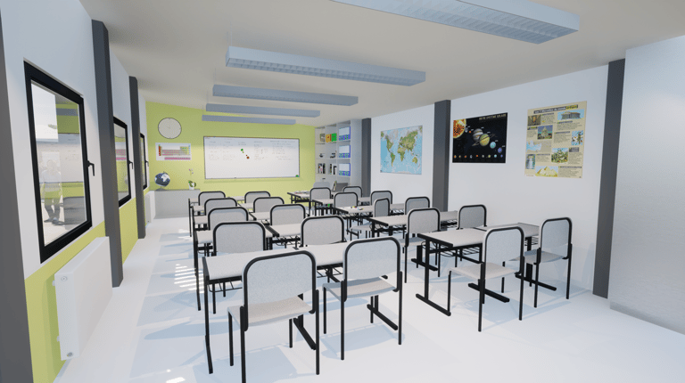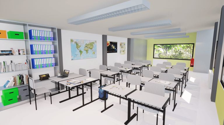 L’équipement comprend un tableau blanc, des armoires de rangement et un bureau pour l’enseignant, garantissant une organisation efficace de l’espace. L’éclairage est assuré par des luminaires LED, tandis qu’un système de chauffage électrique assure un confort thermique optimal en toute saison.